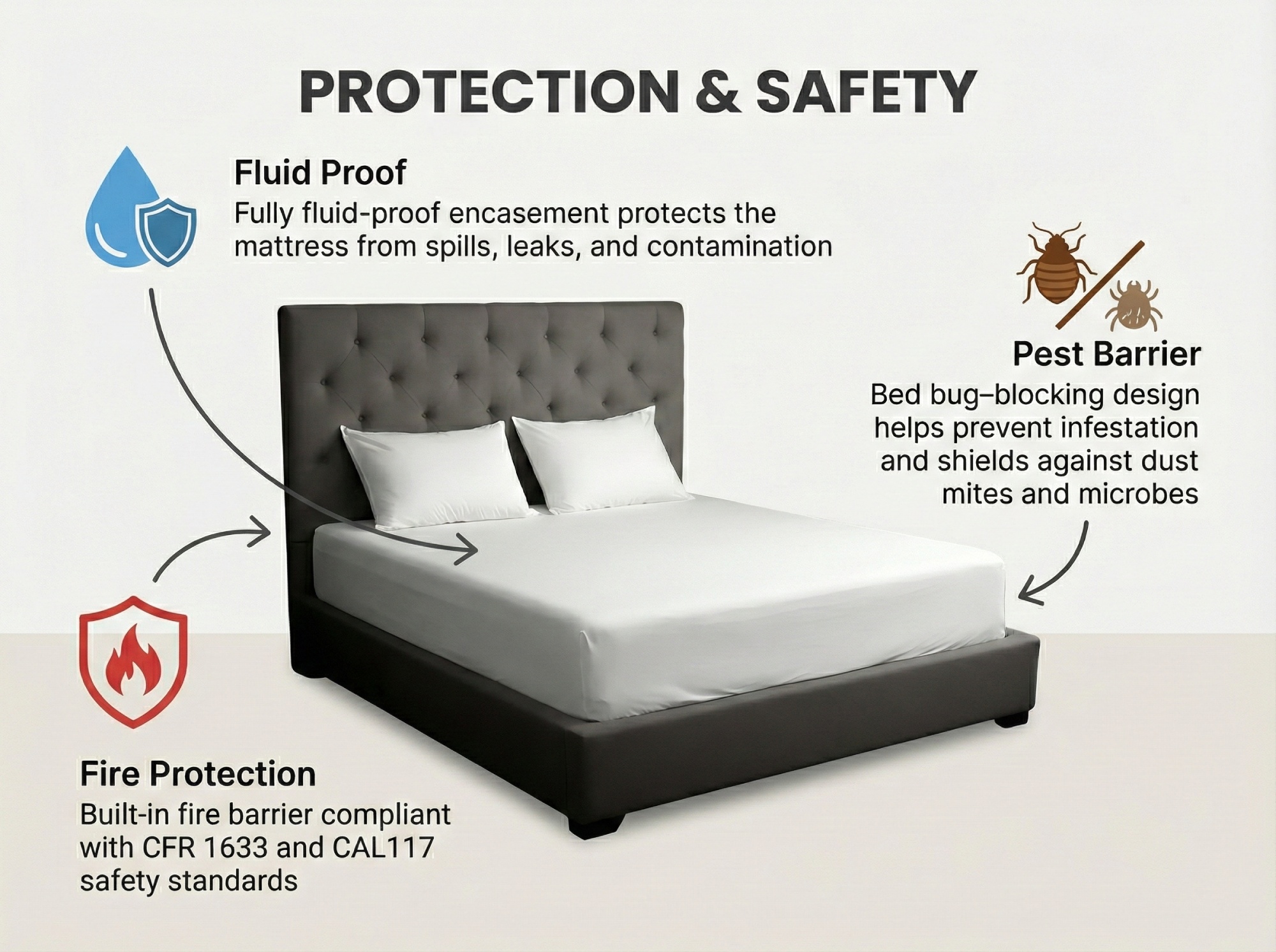 Not only does Mattress Armour offer exceptional comfort, but it also serves as a robust defense against common allergens such as dust mites, fungi, and microbes, making it an essential addition for allergy sufferers. It also features a fire barrier compliant with CFR 1633 and CAL117 standards, providing an extra layer of security for your home.