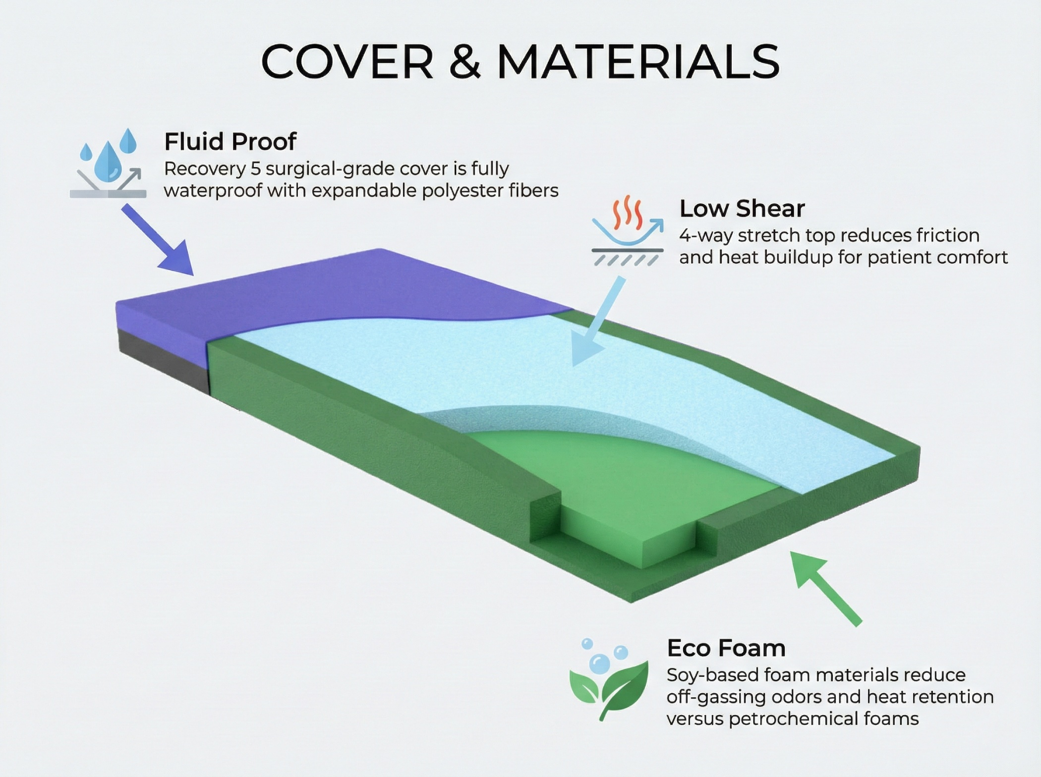 Cover: NSC2500 covers are made with Recovery 5, a surgical grade 4-way stretch top which reduces heat buildup and provides a low shear, non-friction surface, that is anti-microbal and waterproof. A 16 oz Anti-Slip Grip X bottom provides low anti-friction rate for Patient/Resident transfer.