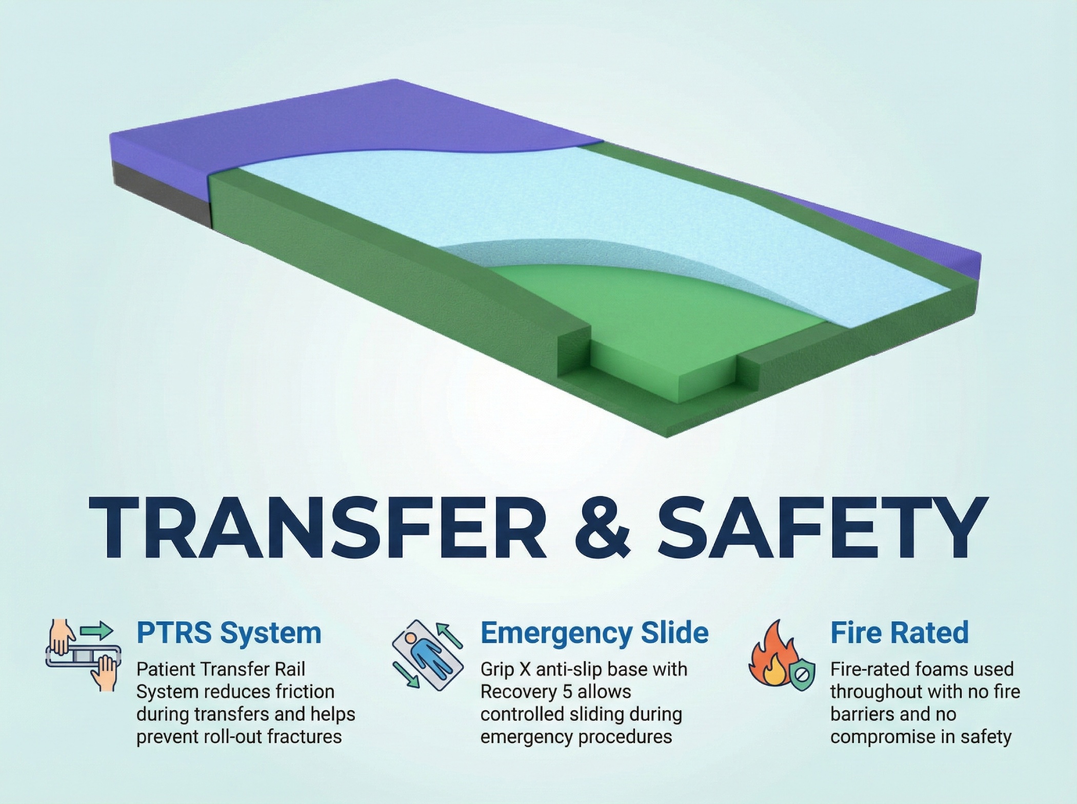 Our NSC2500 consists of our open cell Soy Medi-Foam. Complete with a 2” top layer of breathable visco elastic memory foam, making this a premium pressure redistribution therapeutic surface. With a sloped heel to reduce heel breakdown, the NSC2500 offers high resilience Soy Visco Medi-Foam providing superior weight distribution. With a cover consisting of a 4-way stretch for easy removal, a zipper overlay for infection control and an expandable polyester thread fibre that imbeds itself to material this fabric is completely fluid proof. Our unique PTRS (patient transfer rail system) reduces friction during Patient/Resident transfers and roll out fractures. With an anti-slip, surgical grade base material of Grip X and Recovery 5, the NSC2500 allows for easy slide during emergency procedures, while allowing antislip for precision articulation.